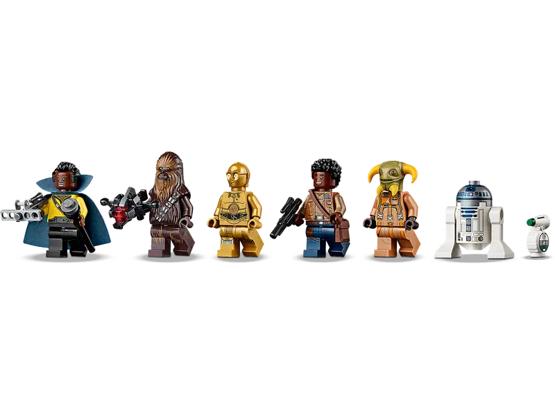 - Comes with 7 characters: Finn, Chewbacca, Lando Calrissian, C-3PO and Boolio minifigures, plus fan-favorite D-O and R2-D2 figures.