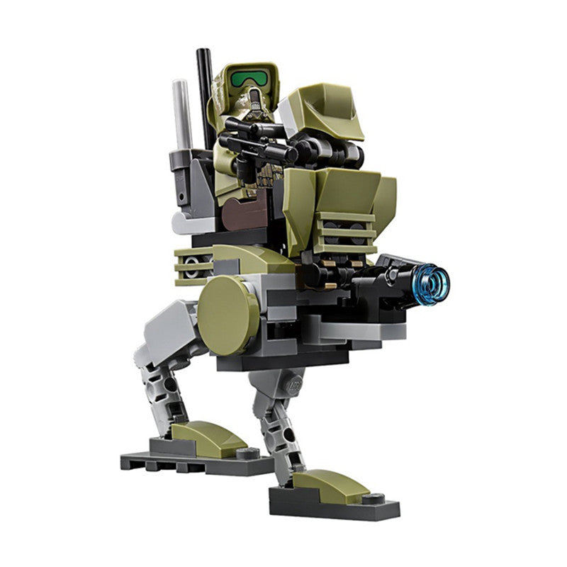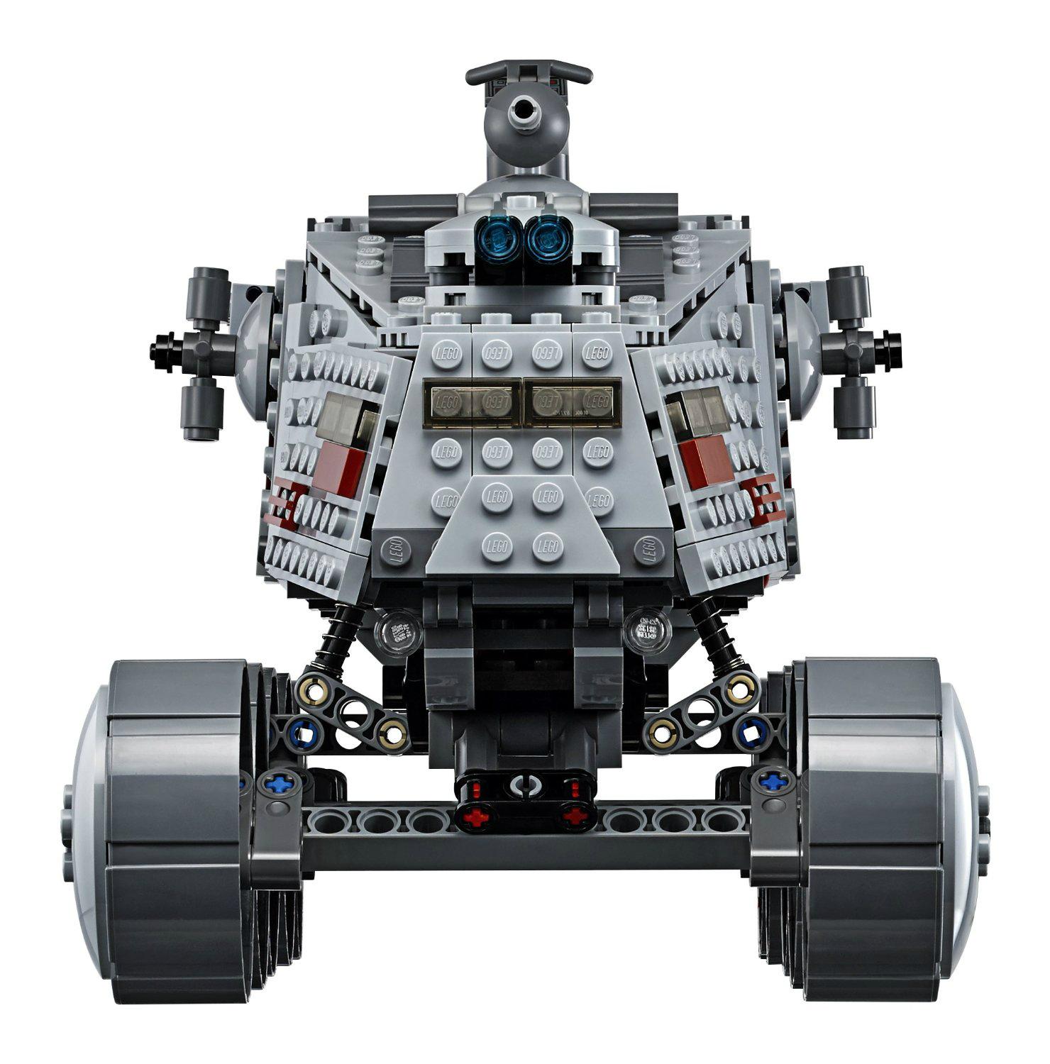 - Features 10 rolling wheels with flexible suspension, rotating weapon turrets, spring-loaded shooters, extending observation post, dual cockpits and panels fold down to reveal a detailed interior, including a mini AT-RT with a stud shooter.