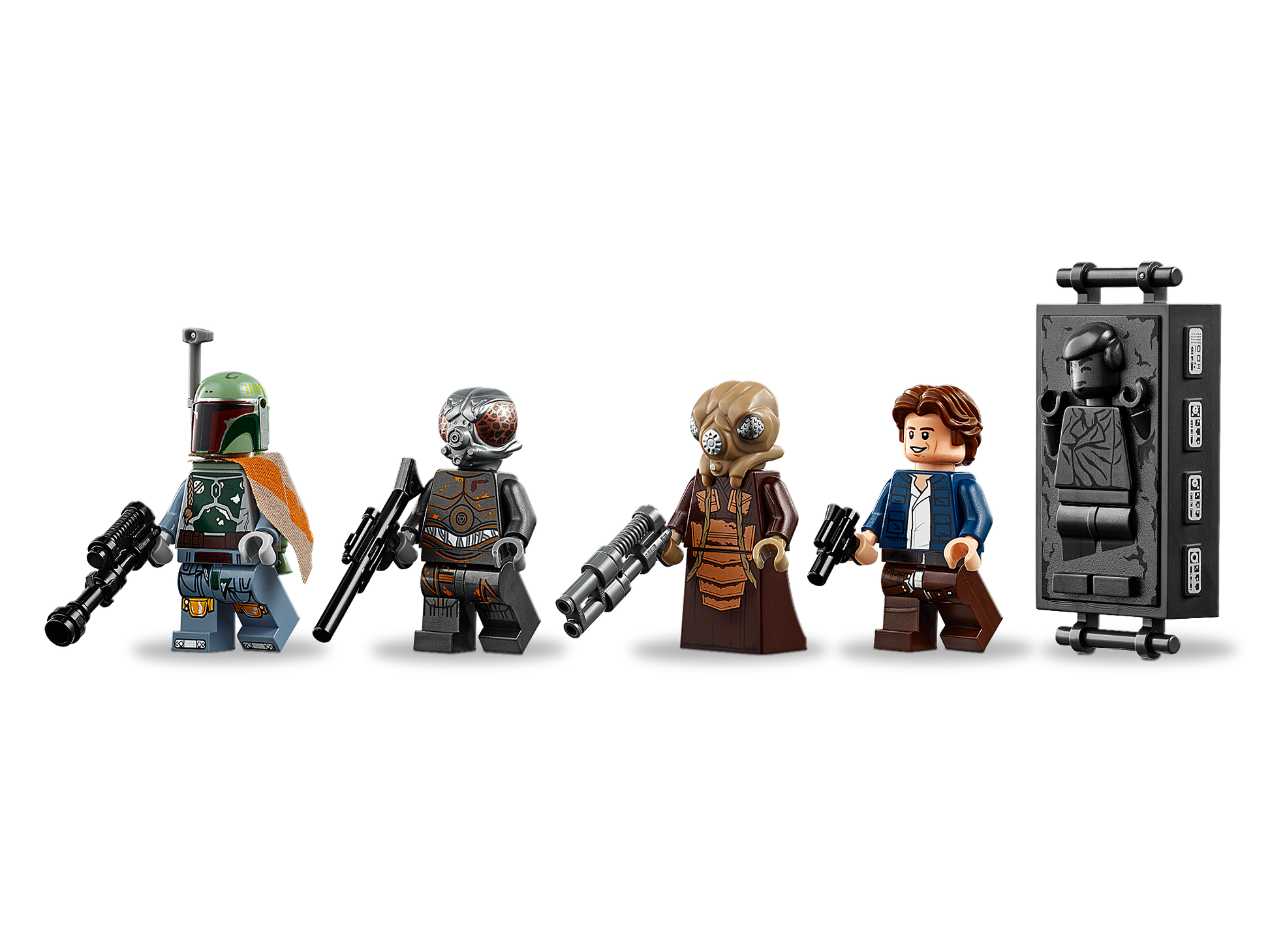 - Construction space toy Includes 5 iconic Star Wars minifigures: Boba Fett, Han solo, Zuckuss, 4-loom and special anniversary Princess Leia. The set also includes a Han solo in Carbonite element.