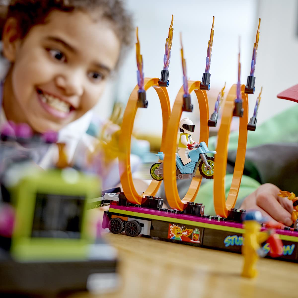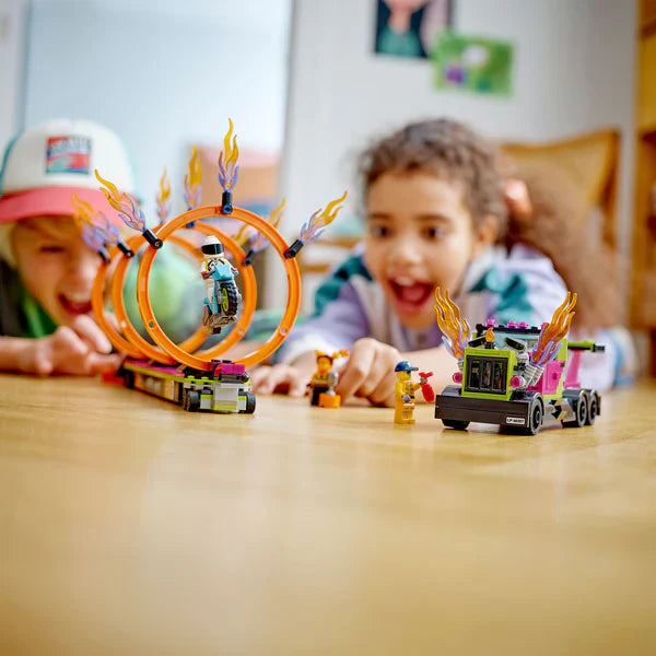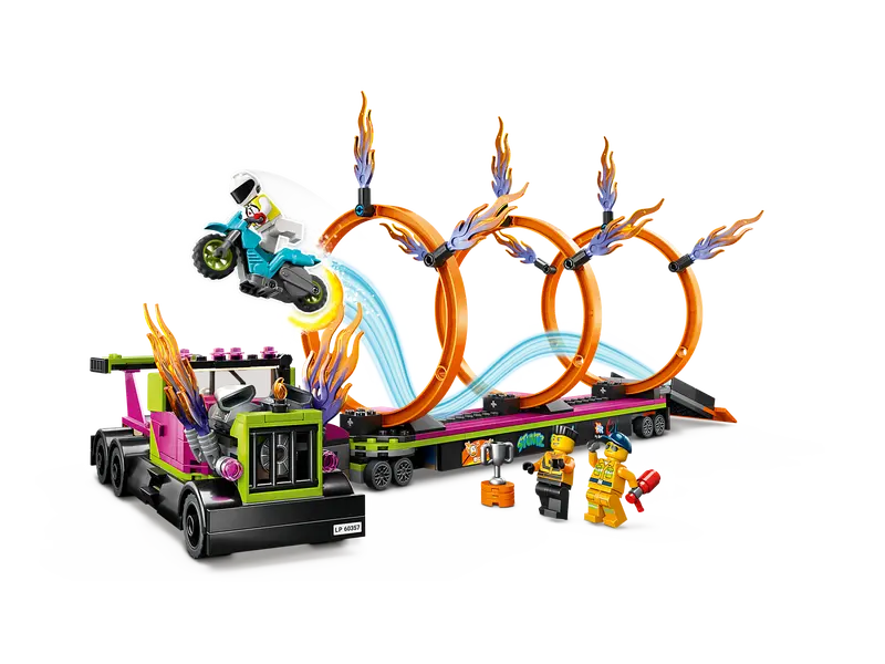 - Kids can put on the ultimate Stunt show with this City Stuntz set including a toy truck, rings of fire, toy motorcycle and 3 minifigures.