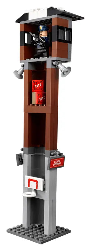 - The lookout tower features five levels and assorted play-inspiring elements including a basketball hoop, two boxes of TNT explosives, three computer monitors and two loudspeakers.