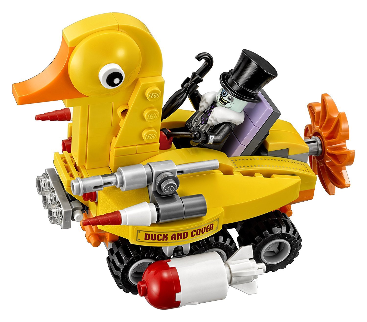- The Penguin’s Duckmobile features a minifigure cockpit with adjustable lever, two dual stud shooters, 2 flick missiles and a rotating propeller.