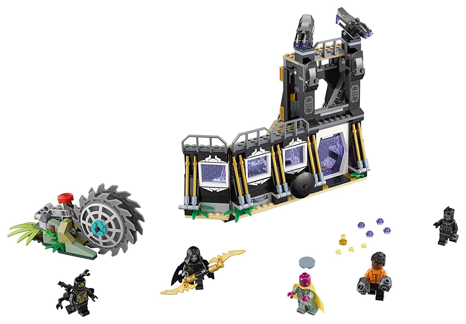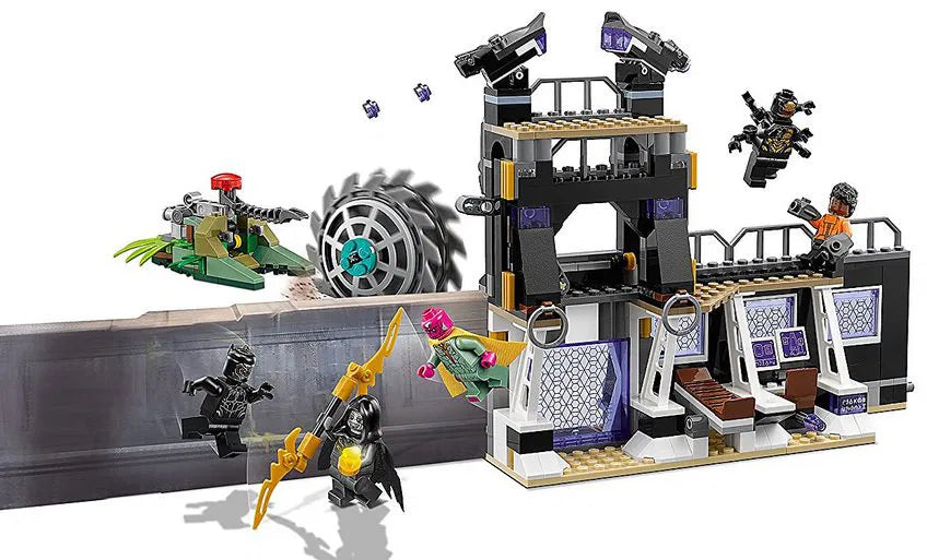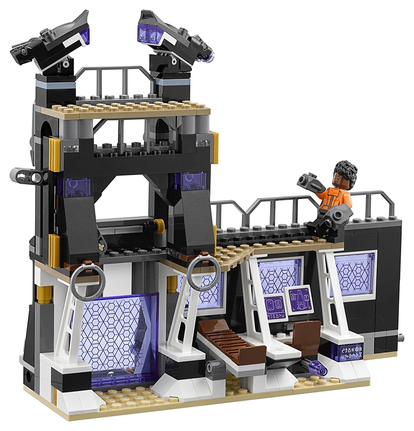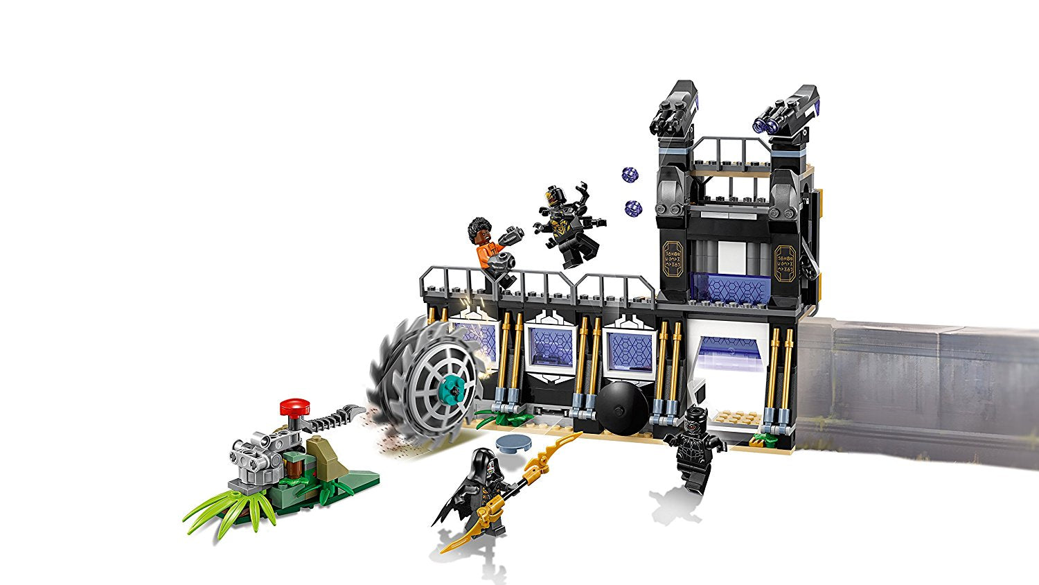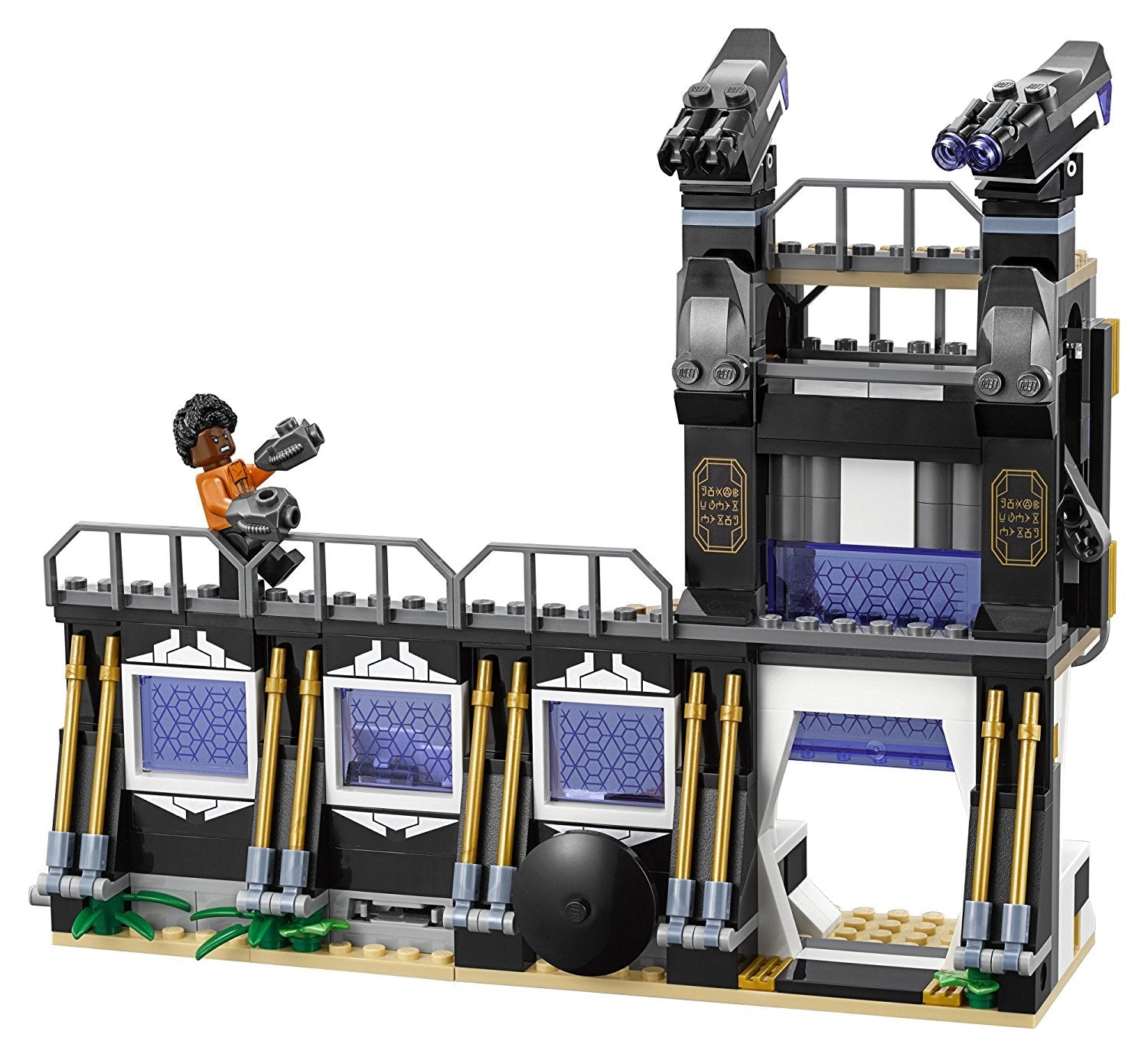 - Wakandan wall features a lever-operated gate, tower with 2 rotating, dual stud-shooting turrets, hidden disc shooter, hinged wall section, lab with minifigure seat, desk and 2 computer screen elements