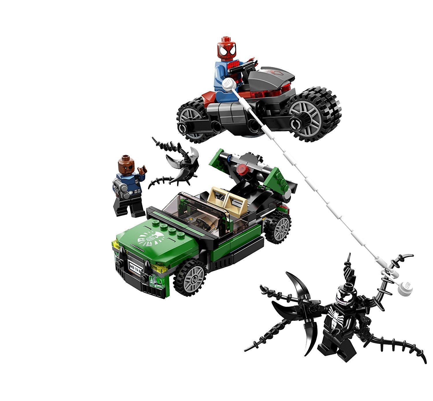 - Includes 3 minifigures: Spider-Man, Venom and Nick Fury with a gun.
