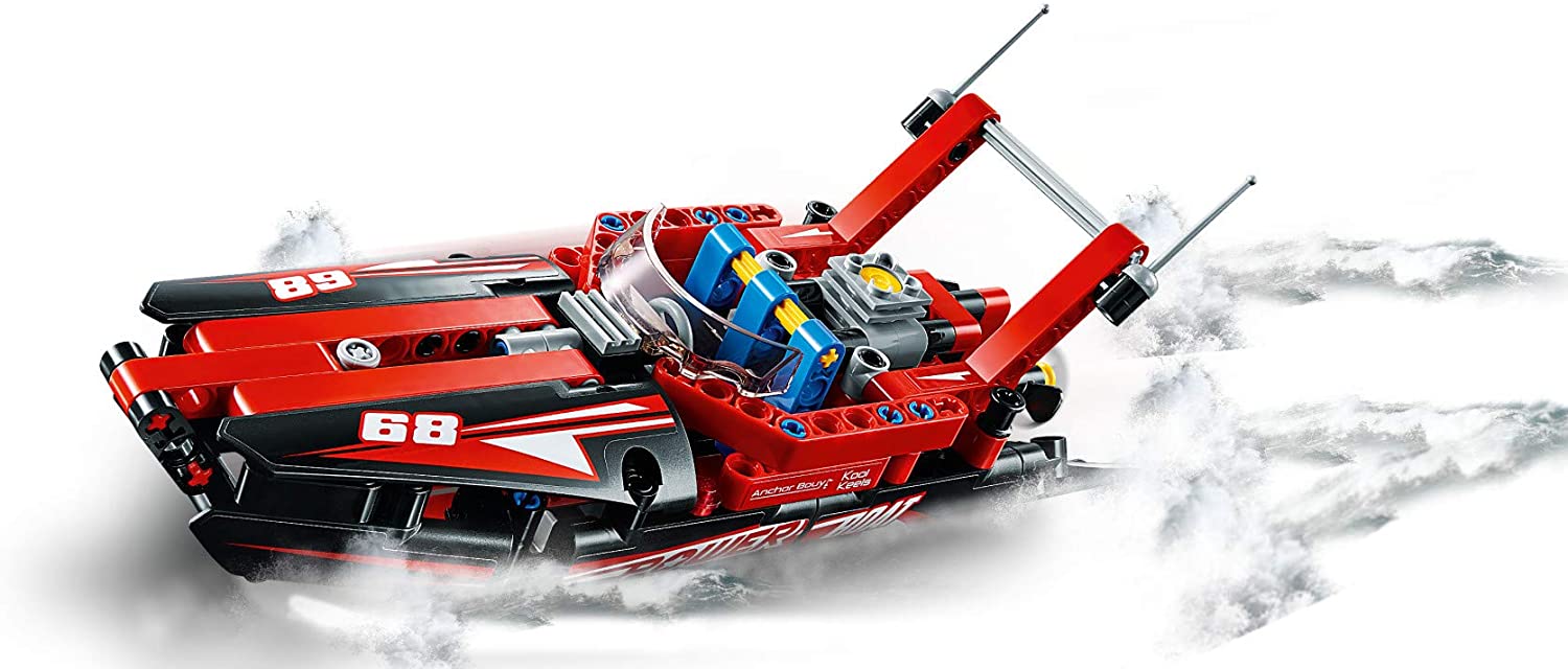 - Thunder to the finish line with the aerodynamic 2-in1 Technic Power Boat replica, featuring a sporty aerodynamic design, open cockpit with steering wheel and tinted windshield, and a red and black color scheme with racing stickers.