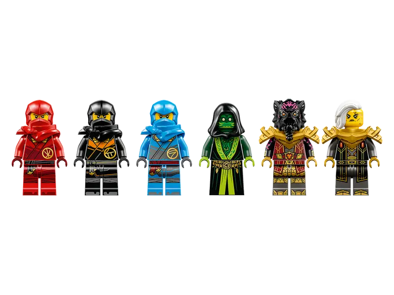 - 6 minifigures – Kai, Nya and Cole, who come with 2 golden katanas each, Spirit of The Temple with a large golden sword, Lord Ras with a golden hammer and Empress Beatrix with her Imperium sword.