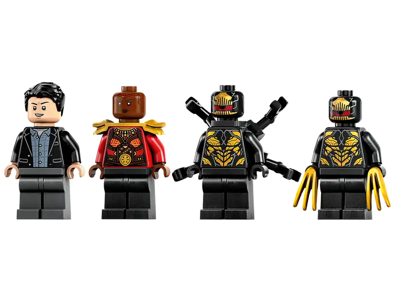 - Includes 4 minifigures: Bruce Banner, whose head turns to reveal a Hulk ‘going green’ face, Okoye, who carries a toy spear and 2 outriders.