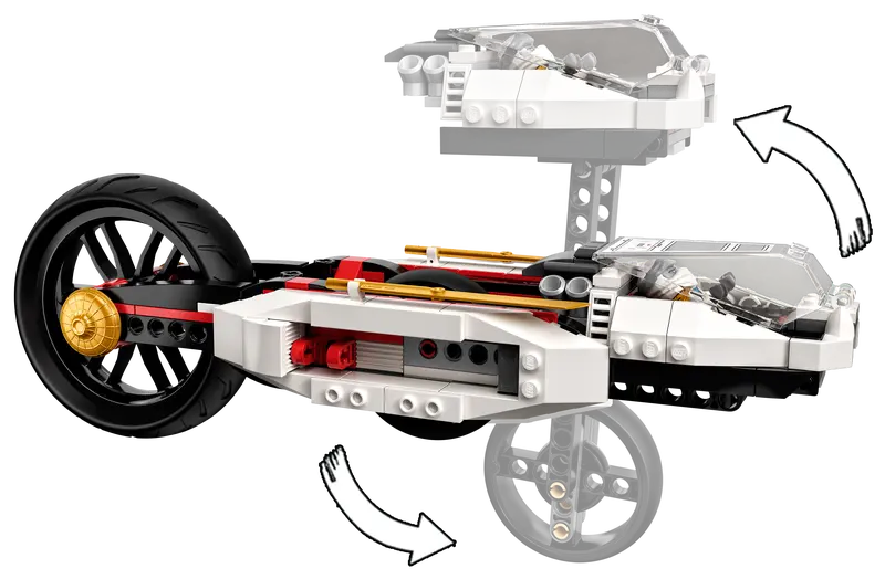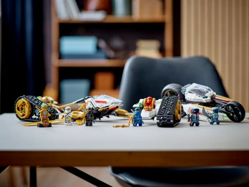 - Kids have the exciting choice to fly the jet plane with spring-loaded shooters or drive the motorcycle toy or 2 all-terrain vehicles. Thereis space in each of the 4 vehicles for a ninja minifigure.