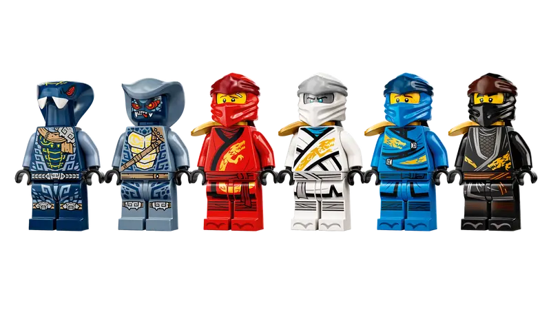 - Action-packed playset includes 7 minifigures: ninjas Kai, Cole, Zane, Jay and Zane Legacy to take on snake soldiers Rattla and Mezmo from season 1 of the NINJAGO TV series.