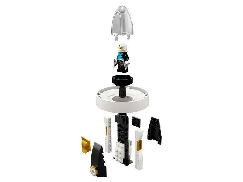 - Features a Spinjitzu spinner with buildable brick handle, spinner element with minifigure capsule and rip cord, weapon rack with 2 ice shurikens, and Zane’s 2 shurikens.